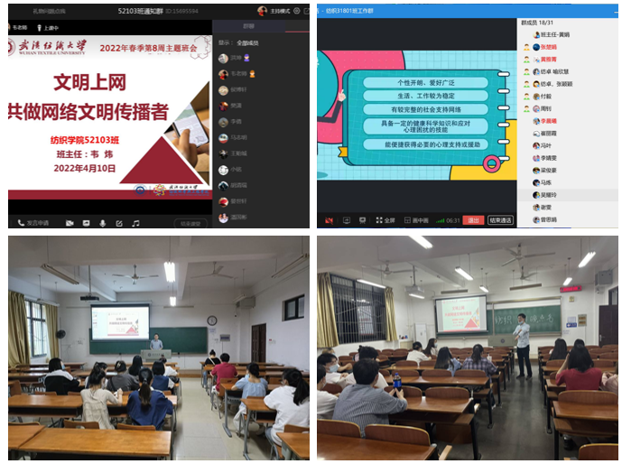 各班团于4月10日晚召开“文明上网,共做网络文明传播者”、“牢记公民责任义务,共筑疫情防护屏障”主题班会。全院班主任、辅导员、在校生通过线上线下的方式共同参与。