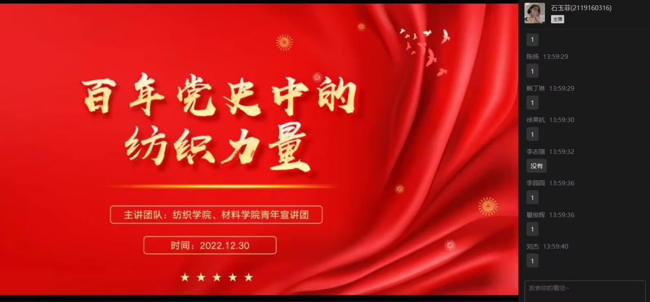 此次宣讲为学校“纺大青年说”青年宣讲团系列活动之一,旨在面向纺大青年学子开展宣讲,把宣讲活动送到党支部、社团、送到学院、班级。同学们在宣讲结束后表示备受鼓舞,立志要在学思践悟中进一步坚定信仰信念信心,把党的二十大精神切实落实到具体的学习工作当中,为全面建设社会主义现代化国家、全面推进中华民族伟大复兴而团结奋斗!