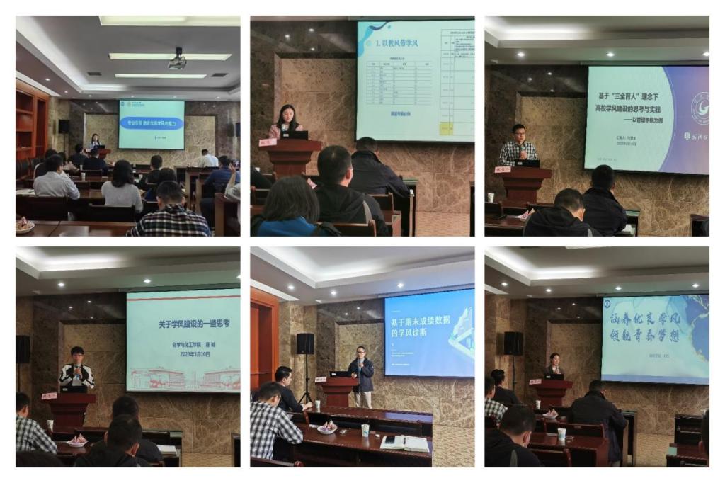 张竣青老师以《专业引领 激发优良学风内驱力》为题,对学生出现的学业问题成因进行分析,总结提出要四位一体,用好学风制度、开展纺织文化宣传、投身科学实践锻炼、用活网络育人平台,引导学生树立专业自信心,激发优良学风内生动力;材料学院王鑫老师以《协同发力 共绘学风建设“同心圆”》为题,将学风内涵进行分析,分享其以教风带学风、严管理督学风、重辅导促学风、立榜样树学风的工作经验;管理学院张朋龙老师以《基于“三全育人”理念下高校学风建设的思考与实践》为题,介绍了管理学院学风建设具体实践路径;化工学院雍诚老师以《关于学风建设的一些思考》为题,分析年级期末考试数据及其背后的内外成因,提出要在思想、管理、环境、制度等层面严抓学风;环境学院郁星老师以《基于期末成绩数据的学风诊断》为题,分析本年级挂科数据情况,针对基础学科挂科率高、男生成绩普遍不如女生等具体问题提出针对性对策;日本动漫