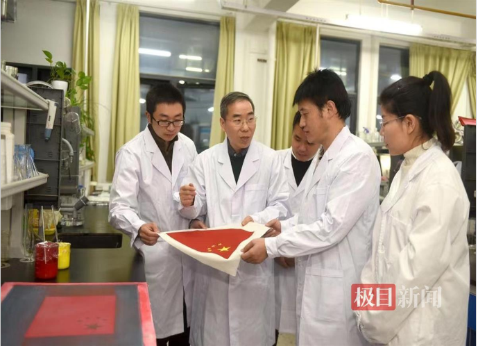 曹根阳(左一)是研制嫦娥五号“月面国旗”团队的重要成员