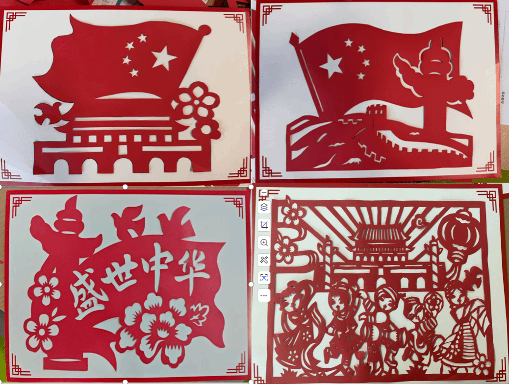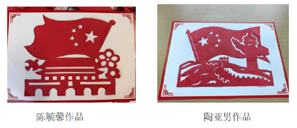 大家时而低头全神贯注地剪、刻,时而抬头交流党的发展历程。随着指尖的精雕细琢和一件件栩栩如生的作品逐渐成形,赞许与欢愉回荡在苑研楼。剪纸作品既展现了同志们对革命先烈的深切敬仰,也让大家从红色文化中领略了传统手艺的独特韵味。陈毓馨同学的作品《红星耀中华》将天安门、和平鸽等元素结合,展现建党百年的辉煌成就。陈毓馨同学说:“剪纸不仅是中华民族传统手艺,今天的剪纸更是一堂生动的党史课!在剪之前,我用手机再次查阅了许多历史资料,深刻感受到党的奋斗历程。这份作品是我对党的生日最真挚的祝福!”陶亚男同志的《盛世中华》剪纸作品以解放碑、长城和国旗为核心元素,通过传统剪纸艺术生动展现了中华民族的奋斗精神与爱国情怀。陶亚男同志说:“在剪这幅作品时,我的手一直很稳,因为每一个图案都承载着沉甸甸的意义。这次创作让我更深刻地理解了什么是‘家国情怀’,我们年轻人不仅要传承传统民族文化,更要传承先辈的这份红色基因。”