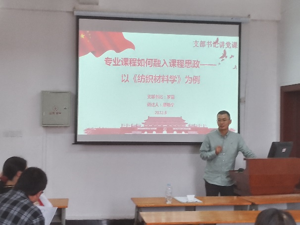 为深入推进习近平新时代中国特色社会主义思想,根据学校及学院党委主题教育统一要求,纤维材料与产品设计系党支部5月24日积极开展“支部书记讲党课”主题党日学习活动。围绕“专业课程如何融入课程思政”主题,支部书记为党员同志讲授党课。党课以《纺织材料学》为例,从课程思政的实施原则与方法、典型课程思政案例挖掘及教案撰写等三个方面进行了阐述。