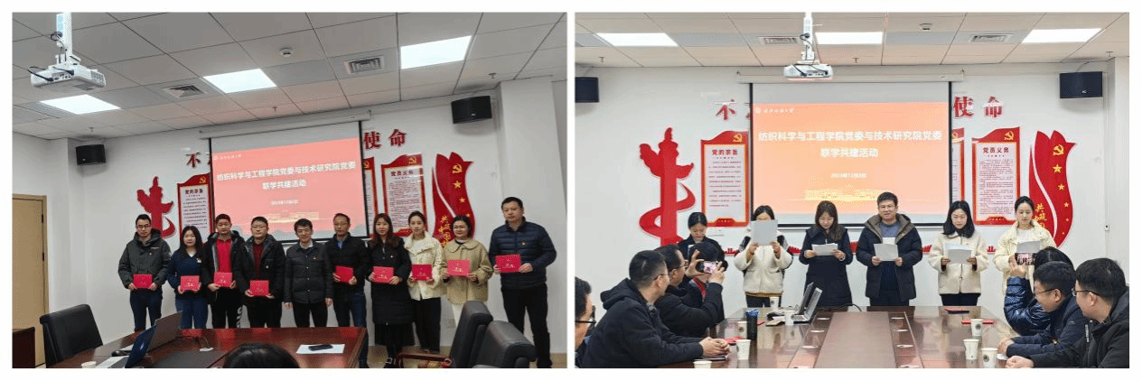 党委书记朱张军、技术研究院党委书记涂耀威共同签订《党建联学共建协议书》,为两院构建资源共享、优势互补、提升互促的党建工作新格局筑牢根基。朱张军指出,两院一直以来就是“同气连枝”的共同体,共同在“纺织”大学科的枝丫上汲取养分,也立足岗位贡献力量。希望未来双方能在打通壁垒中打造新引擎,在互学互鉴中激发新活力,在联合学习中探寻新发展。随后,在全体党员的见证下,会上,双方党组织负责人为12月入党的党员代表赠送“政治生日”贺卡,党员代表进行红色诗歌朗诵展示,引导党员时刻不忘自己的“第一身份”,发挥先锋模范作用。最后,涂耀威在总结讲话中表示,“联学共建”不仅在纸面上,更在实际工作点滴之中,本次活动是技术研究院党委与日本动漫