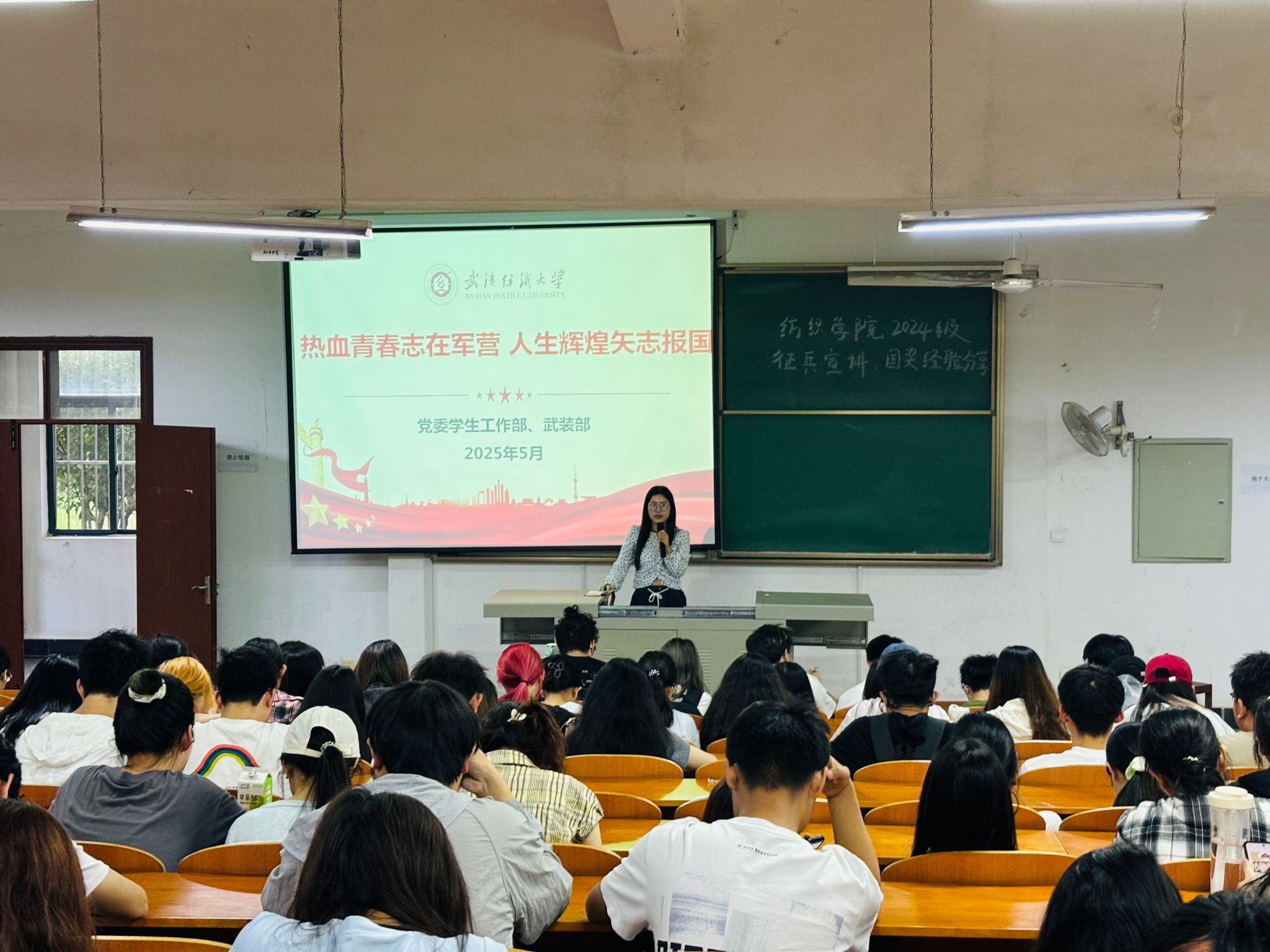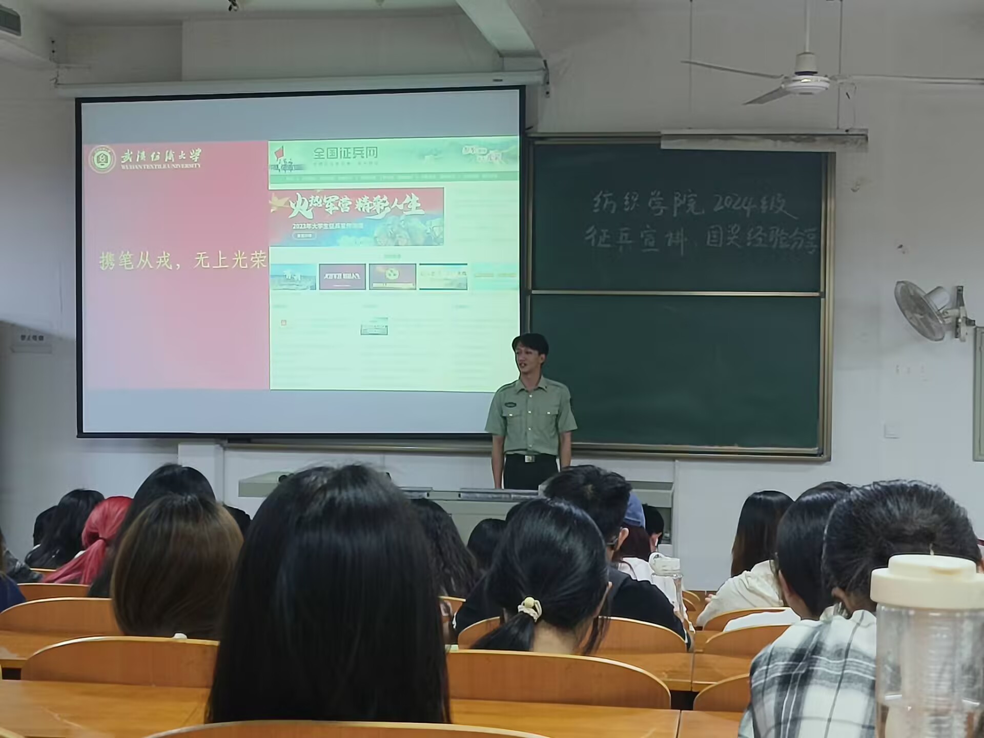 逐梦军旅,砥砺青春。纺织工程12204班退伍大学生郭子扬结合自身入伍经历,生动幽默地讲述了部队生活的点滴,展现了部队对个人意志品质的磨砺和综合素质的提升。其中着重讲解了应征入伍的重要意义、服役待遇及发展前景等,鼓励同学们积极响应国家号召,投身军营,将个人理想融入强国强军伟大事业,在绿色军营中实现人生价值。