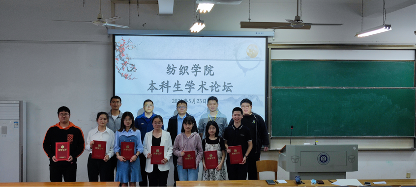 7名本科生做了主题报告。纺织 11801班谢雨珍同学做了题目为《高性能电磁屏蔽织物的研究》的主题报告,介绍了通过镀银纤 维和聚氨酯纤维加捻,用不同的编织方式形成具有良好电磁屏蔽,透气、柔软、 可调节的织物。纺织 11802 班郭世贸同学做了主题为《分散染料对聚酰亚胺的颜色构建》的报告,通过使用载体染色法以及分散染料,使得聚酰亚胺难染色问题得到进一步的突破。纺织 11803 班三彩虹同学做题目为《紫甘蓝色素酸碱变色与湿敏变色探究》的主题报告,通过对天然染料的研究,填补国内无重金属湿度敏感变色材料的技术开发。纺织 51801 班汤恒星同学做题目为《一种具有间隔色彩的新型纱线》的主题报告,通过调控 有色涤纶长丝与原棉纤维的内外转移运动,从而获得具有间隔色彩效果的涤棉复 合纱。纺织 51802 班杨青青同学做题目为《“共织型”柔性防弹层》的主题报告,通过利用纺织技术将针织结构与机织平纹结构相结合的方法,达到更好的弹道防护性能。纺织 51803 班肖惠同学做题目为《可拉伸导电纱线》的主题报告,通过利用高弹性氨纶长 丝改善导电纱线的拉伸性。非织 11801 班范静媛同学做题目为《水葫芦资源的开发与利用》的主题报告,通过将水葫芦 秸秆加工成污水处理吸附剂,同时解决水葫芦泛滥和污水污染问题。