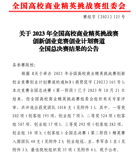 10月24日,全国高校商业精英挑战赛组委会发布了《关于2023全国高校商业精英挑战赛创新创业竞赛创业计划赛道全国总决赛结果的公告》(赛组字[2023]125号)。在这份激动人心的公告中,我们看到了我院的优秀成绩。在我院于志财、庄燕、刘可帅三位老师的精心指导下,其学生团队在竞赛中表现出色,荣获了全国一等奖2项和全国二等奖1项的优异成绩!这不仅是对我院师生的肯定,也是对我们在商业精英培养方面的努力的认可。全国高校商业...